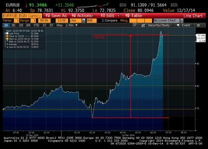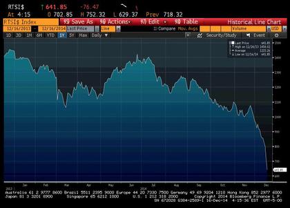 Po godzinie 21 czasu polskiego, kurs rubla do głównych walut stabilizował się. Euro kosztuje 84,9 rubli (wobec 80 rubli w poniedziałek wieczorem), a dolar 68 rubla (64 ruble dzień wcześniej). Indeks giełdowy RTS zakończył dzień spadkiem o 89 punktów (12 proc.)
