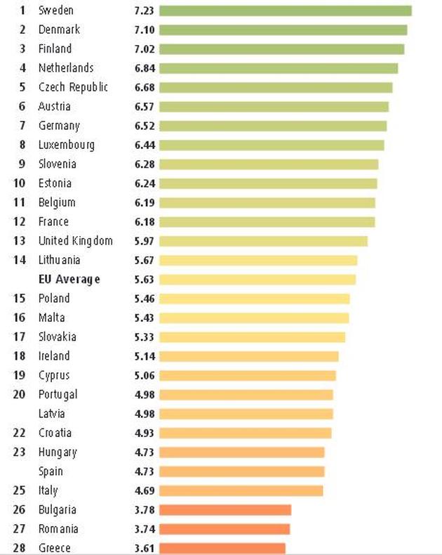 Ranking krajów wg wartości Indeksu Sprawiedliwości Społecznej, obliczanego przez Fundację Bertelsmanna. Źródło: Fundacja Bertelsmanna.