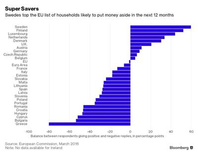 Ostatnie badania przeprowadzone przez Komisję Europejską (z marca 2016 r.) wskazuje, że w przypadku szwedzkich gospodarstw domowych wskaźnik obrazujący różnicę pomiędzy deklarującymi oszczędzanie a wydawanie środków w ciągu najbliższych 12 miesięcy wynosi niemal +60 proc. Za Szwedami znaleźli się Finowie, zaś ostatnie miejsce na podium zajęli Luksemburczycy.