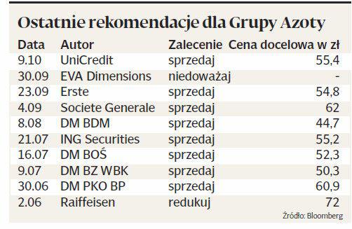 Cena docelowa to 55,4 zł. To kolejna w ostatnich miesiącach negatywna rekomendacja dla największej w Polsce grupy chemicznej. Azoty to najgorzej oceniana spółka z WIG30, jeśli chodzi o potencjał zmiany notowań — negatywna jest każda z dziesięciu ostatnich rekomendacji od analityków. — Obecna sytuacja na rynku zbóż i kontynuacja spadku ich cen jest niesprzyjająca dla segmentu nawozów, który był kluczowy dla wyników grupy w ostatnich kwartałach. Ponadto spółka ma w planach kosztowne inwestycje, które będą obciążać przepływy pieniężne, i jest notowana z premią w stosunku do porównywalnych spółek zagranicznych. Nie widzimy uzasadnienia dla tej premii — mówi Łukasz Jakubowski, analityk UniCredit. Notowania spółki trzymały poziom do końca sierpnia, ale od tego czasu kurs spadł o ponad 15 proc. Lepiej w ostatnich tygodniach wiedzie się spółkom z grupy — Puławom i Policom, których notowania są dość stabilne.