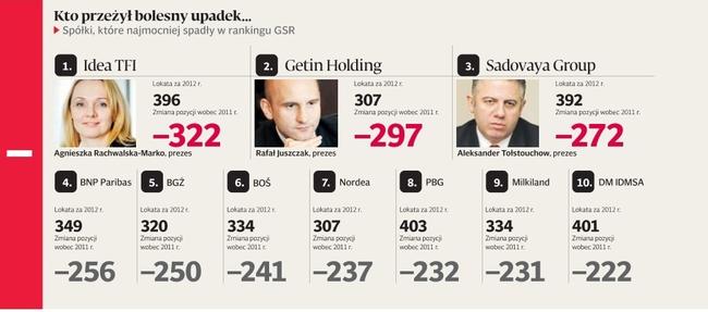Od Getinu Holding gorzej wypadła tylko Idea TFI, towarzystwo, które zaliczyło mnóstwo wpadek inwestycyjnych oraz przeżyło bezprecedensową ewakuację klientów i pracowników. W oczach ekspertów bardzo wiele stracił też DM IDMSA, broker kontrolujący Ideę, oraz Sadovaya Group, ukraińska spółka górnicza, którą kiepska koniunktura zmusiła do wygaszenia produkcji na wiele miesięcy.