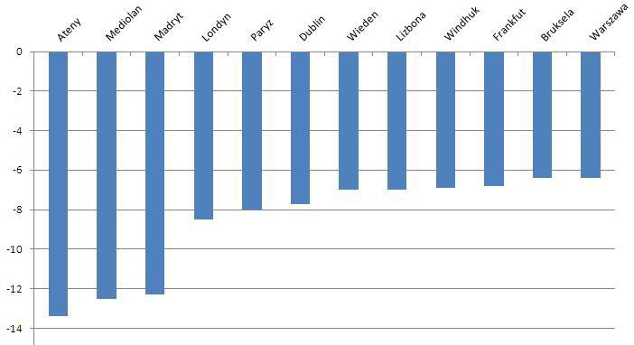 WIG20, wyrażony w euro, zniżkował w piątek o 6,4 proc., co dało mu 12. miejsce wśród najmocniej tracących głównych indeksów giełdowych na świecie. Na listę trafił tylko jeden wskaźnik spoza Europy – główny indeks egzotycznej giełdy w Namibi FTSE JSE. Trzej najwięksi spadkowicze rekrutowali się spośród giełd do niedawna objętych kryzysem krajów peryferii strefy euro. Główne wskaźniki giełd w Atenach, Mediolanie i Madrycie tąpnęły o co najmniej 12 proc. (indeks PSI20 z Lizbony zanurkował o 7 proc.). Indeksy z wychodzących z kryzysu krajów peryferyjnych charakteryzują się większą zmiennością, przez co bardziej tracą w momentach rynkowych zawirowań.