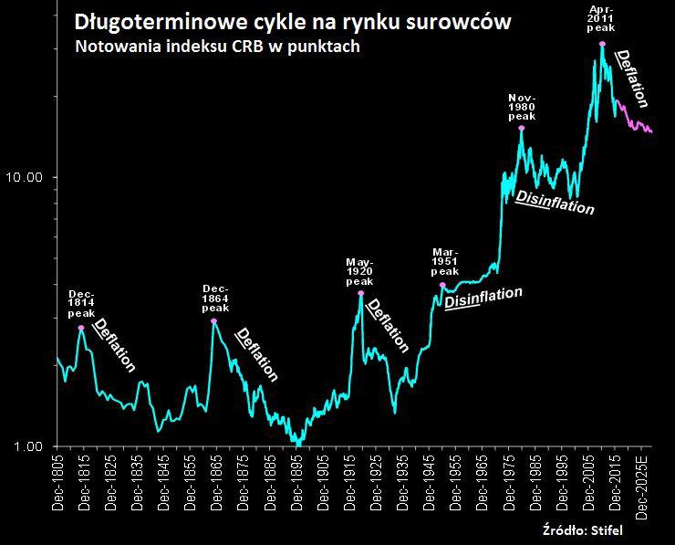 Długoterminowe cykle w notowaniach surowcowego indeksu CRB w ostatnich 210 latach. Na wykresie oznaczono momenty osiągnięcia szczytu oraz adnotację czy późniejsza bessa była związana z deflacją, czy jedynie dezinflacją (wyhamowaniem inflacji). Źródło: Stifel.