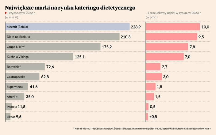 Największy w branży pozostaje Maczfit kontrolowany przez grupę Żabka. Żabka kupiła tę firmę (od funduszu Resource Partners) oraz Dietly, czyli internetową porównywarkę diet, dwa lata temu w ramach transakcji wartych łącznie ponad 300 mln zł. Zainwestowała potem m.in. we własną logistykę oraz produkcję dań gotowych dla sklepów convenience.