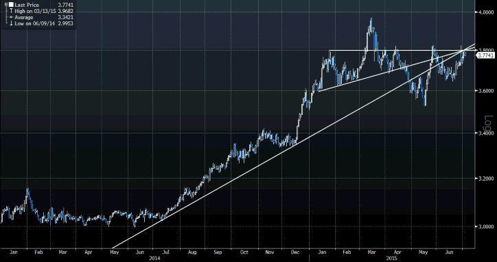 Linie składające się na strefę oporu na wykresie notowań dolara, leżącą na wysokości 3,80 zł. Źródło: pb.pl, Bloomberg.