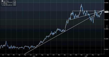 Składają się na nią przełamana pod koniec kwietnia linia rozpoczętego rok temu trendu wzrostowego, przełamana linia szyi formacji głowy z ramionami, która ten trend wieńczyła, oraz strefa oporu wyznaczona przez pięć zanotowanych od początku roku szczytów. Złamanie linii trendu oraz ukształtowanie formacji jego odwrócenia nie musi jeszcze oznaczać, że dolar wejdzie w tendencję spadkową. Jednak szansa, że wróci do zwyżek, należy uznać za mniej prawdopodobną. Warunkiem pozostaje jednak to, że dojdzie do przełamania strefy oporu na wysokości 3,80 zł.