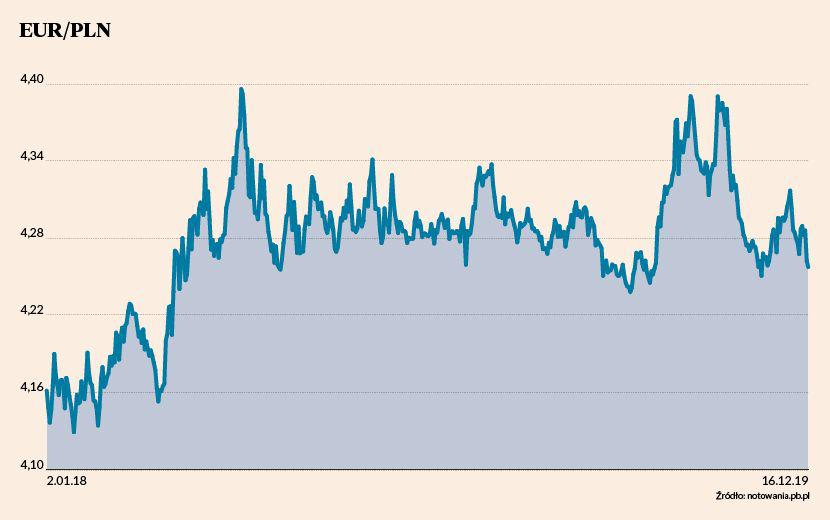 W czerwcu tego roku za euro płacono niespełna 4,24 zł, ale na przełomie sierpnia i września i później znów pod koniec września kurs EUR/PLN wzrósł do niemal 4,40 zł. Przez większą część roku zakres wahań był jednak mniejszy, a kurs mieścił się w przedziale 4,25- 4,34 zł. W 2020 r. status quo zostanie utrzymany, uważają ekonomiści Santandera, choć w pierwszych miesiącach roku notowania mogą się zbliżyć ich zdaniem do 4,25 zł (obecnie to 4,26 zł), jeśli w Wielkiej Brytanii nie zdarzy się nic, co mogłoby wydłużyć drogę tego kraju do opuszczenia Unii Europejskiej, a relacje między Stanami Zjednoczonymi a Chinami nie pogorszą się po podpisaniu w ubiegły weekend umowy pierwszej fazy.