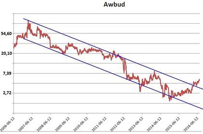 Akcje Awbudu, za które w latach świetności płaciło się ponad 50 zł, a nawet 100 zł, kosztują dziś zaledwie 5,50 zł. Mimo to budowlana spółka najgorsze wydaje się mieć już za sobą. Dzięki restrukturyzacji zyskiem zamknęła pięć kwartałów z rzędu, a poprawę postrzegania wśród inwestorów potwierdza analiza techniczna. Notowania wyszły górą z kanału spadkowego, po ruchu powrotnym znalazły się najwyżej od ponad dwóch lat, a to może nie być koniec, zważywszy że wskaźnik cena/zysk dla spółki sięga zaledwie 8,4.