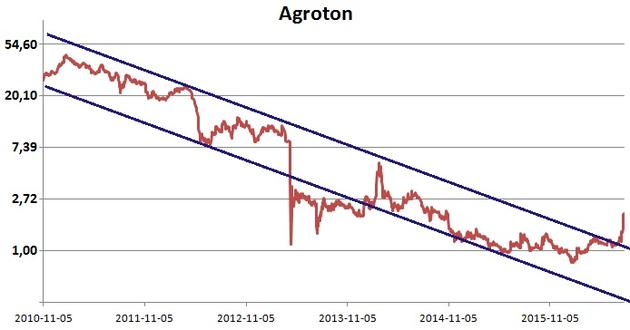 Zakończenie długiej i ciężkiej bessy świętować mogą akcjonariusze Agrotonu. Ostatnie zwyżki doprowadziły do wybicia górą z długoterminowego kanału spadkowego, sięgającego początku notowań spółki. Zła wiadomość dla chcących wsiąść do uciekającego pociągu jest taka, że po trzech tygodniach kurs znajduje się już o blisko 80 proc. powyżej przełamanego oporu, a to grozi korektą. Abstrahując od skrajnego rozgrzania rynku papiery ukraińskiego producenta rolnego wydają się mieć dobre perspektywy. Choć kurs znalazł się najwyżej od blisko dwóch lat, to jednak wartość rynkowa spółki wciąż sięga zaledwie 15 proc. wartości księgowej.
