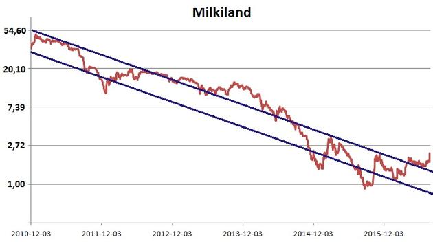 Bessa, która między grudniem 2010 r. a sierpniem 2015 r. zmiotła ponad 98 proc. wartości akcji Milkilandu, należy już do przeszłości. Wszystko przez wyjście kursu górą z kanału opisującego tendencję spadkową. Reprezentant ukraińskiej branży spożywczej wciąż notuje straty, jednak obecna wycena to zaledwie 13 proc. wartości księgowej. Potwierdzeniem rozpoczęcia hossy będzie wyjście na kilkunastomiesięczne maksimum, czyli przełamanie pułapu 2,30 zł.