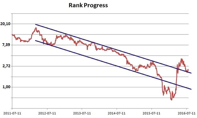 Czteroletnią bessę prawdopodobnie zakończył Rank Progress. Aby korzystny scenariusz się zrealizował, notowania muszą utrzymać się powyżej górnego ograniczenia kanału spadkowego, które przełamały w kwietniu (1,97 zł). Nawet jeśli tak się stanie, nie będzie to z góry oznaczało hossy, a być może zaledwie trend boczny. Choć papiery spółki są warte zaledwie 13 proc. tego, co przypadająca na nie wartość księgowa, to jednak spółka mocno na to „zapracowała”, notując dwa lata z rzędu straty przekraczające 50 mln zł.