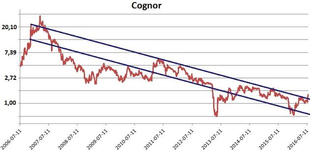 W ostatnim raporcie kupno akcji Cognora zalecił Maciej Bobrowski z BDM. Specjalista wycenił papiery hutniczej spółki na 1,73 zł, aż o 94 proc. poniżej notowań od szczytu z 2007 r. Do wartości sprzed dziewięciu lat akcje spółki pewnie nie powrócą już nigdy, jednak także według analizy technicznej szanse na zyski są spore. Notowania opuściły kanał spadkowy, który dominował na wykresie przez dziewięć lat, a wraz z wyjściem kursu na blisko 12-miesięczny szczyt trend zmienił się na wzrostowy.