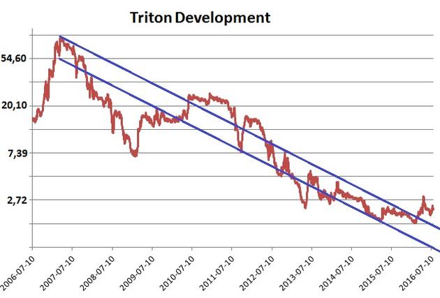 Wyprzedaż papierów Triton Development została zatrzymana, choć sama spółka nie zanotowała zysków od 18 kwartałów. Analiza techniczna daje nadzieje, że dno nie zostanie pogłębione, po tym jak wskaźnik ceny do wartości księgowej spadł do zaledwie 0,16. Notowania papierów dewelopera opuściły górą kanał spadkowy, który opisywał je przez większą część ostatnich dziewięciu lat. Aby mówić o hossie kupujący będą musieli jednak wypchnąć kurs powyżej ostatniego szczytu, czyli pułapu 2,95 zł.