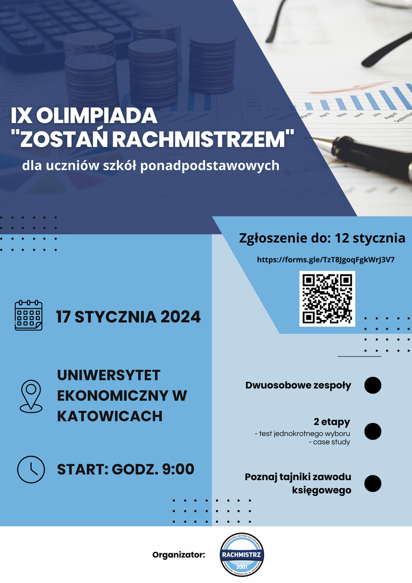 Koło Naukowe „Rachmistrz” działające na Uniwersytecie Ekonomicznym w Katowicach ma dla Ciebie taką możliwość. 17 stycznia 2024 w Auli CNTI przy ul. Bogucickiej 3 w Katowicach wszyscy ciekawi tajników zawodu księgowego będą rywalizować w dziewiątej edycji olimpiady „Zostań Rachmistrzem” o atrakcyjne nagrody od firmy PwC SDC w Katowicach - ekspertów w dziedzinie księgowości i audytu.