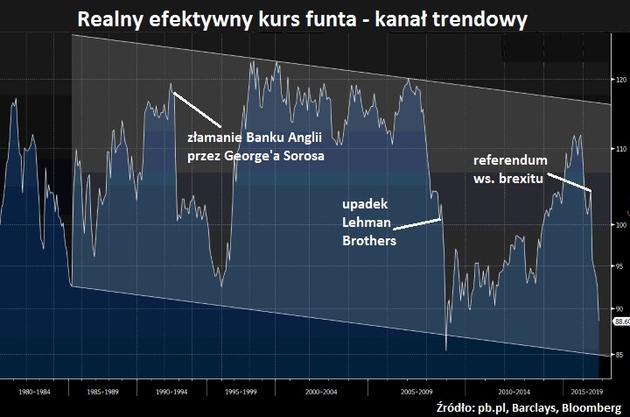 Skorygowany o inflację kurs funta wobec głównych partnerów handlowych Wielkiej Brytanii, bo właśnie to odzwierciedlają notowania tworzonego przez Barclays indeksu, poruszał się w historii wewnątrz lekko opadającego kanału. Poprzednie fale wyprzedaży, związane z przewartościowaniem funta zakończonym złamaniem Banku Anglii przez George'a Sorosa oraz upadkiem banku Lehman Brothers, prowadziły do zejścia notowań funta z okolic górnego ograniczenia formacji do jej dolnego ograniczenia.