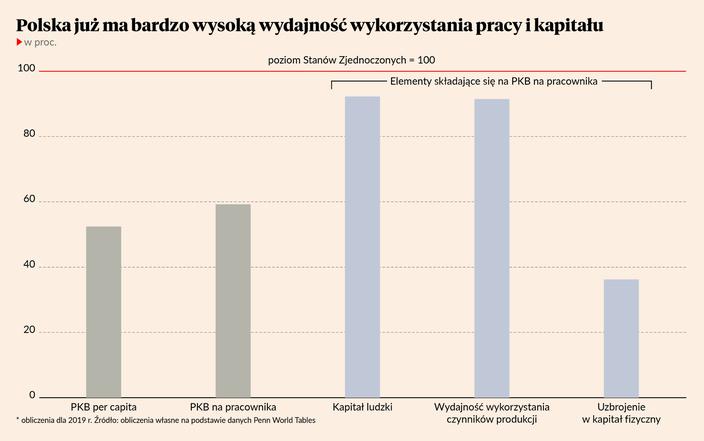 Po drugie, patrząc od strony podażowej, Polska rozwijała się bardzo szybko dzięki dynamicznemu zwiększaniu wydajności, z jaką wykorzystuje się kapitał i pracowników. Tej wydajności też nie da się jednak dalej szybko zwiększać, ponieważ jest już zbliżona do poziomu cechującego amerykańską gospodarkę. Innymi słowy, z maszyn i ludzi wyciskamy bardzo dużo i nie możemy już rozwijać się szybko tylko dzięki wyciskaniu jeszcze więcej. Potrzebujemy więcej maszyn, czyli kapitału fizycznego.
