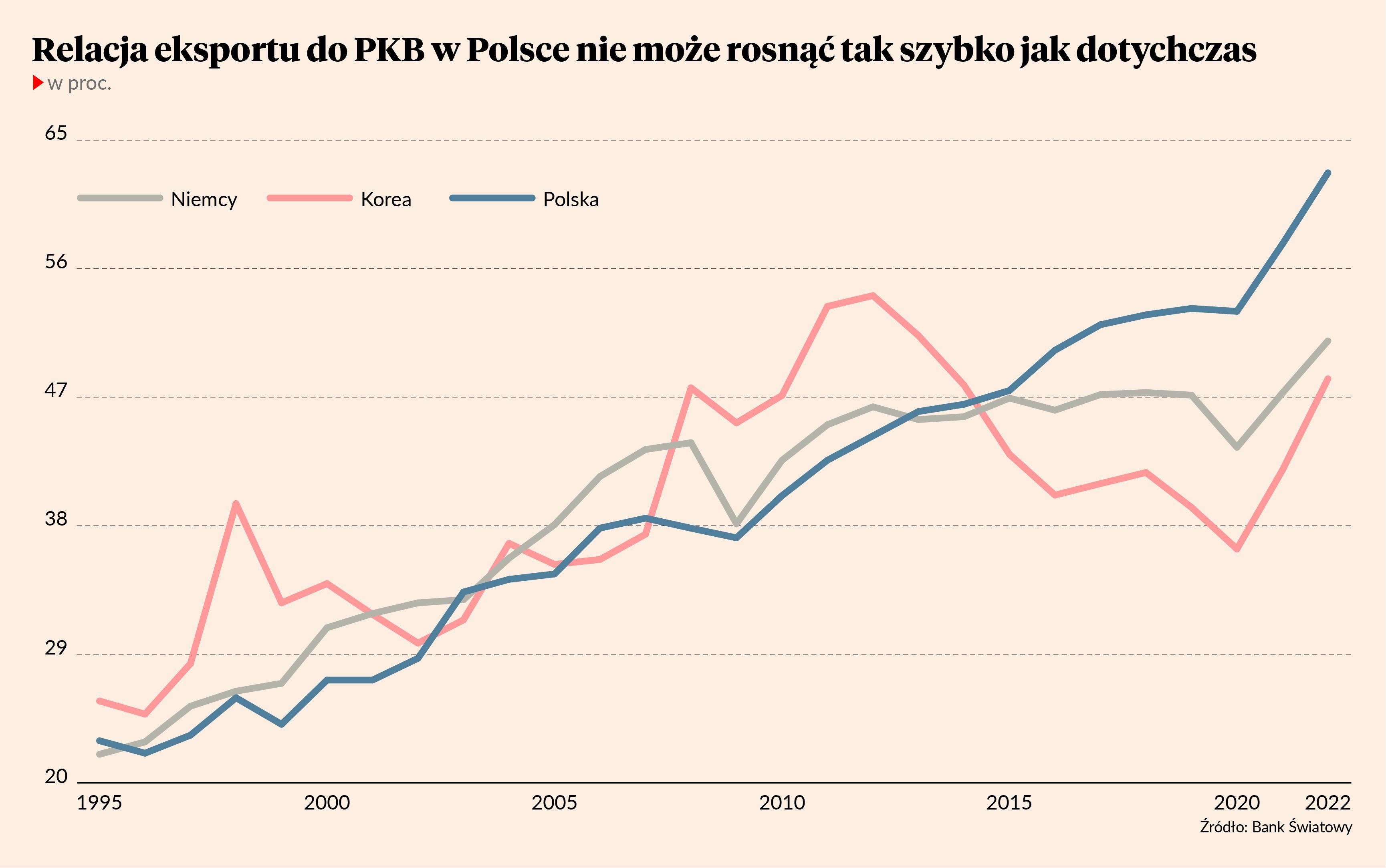 Po pierwsze, patrząc od strony popytowej, Polska rozwijała się – szczególnie w ostatnich 10-15 latach – w dużej mierze dzięki wzrostowi eksportu. Nie da się tego kontynuować w tak dynamiczny sposób jak do tej pory, ponieważ relacja eksportu do PKB jest w Polsce wyjątkowo wysoka jak na wielkość kraju. Wynosi ponad 60 proc., podczas gdy w Korei jest to niecałe 50 proc., we Włoszech niecałe 40 proc., a w Niemczech równo 50 proc. Włączanie firm z Polski w międzynarodowe łańcuchy dostaw nie może przebiegać tak szybko jak w ostatnich 10-20 latach.
