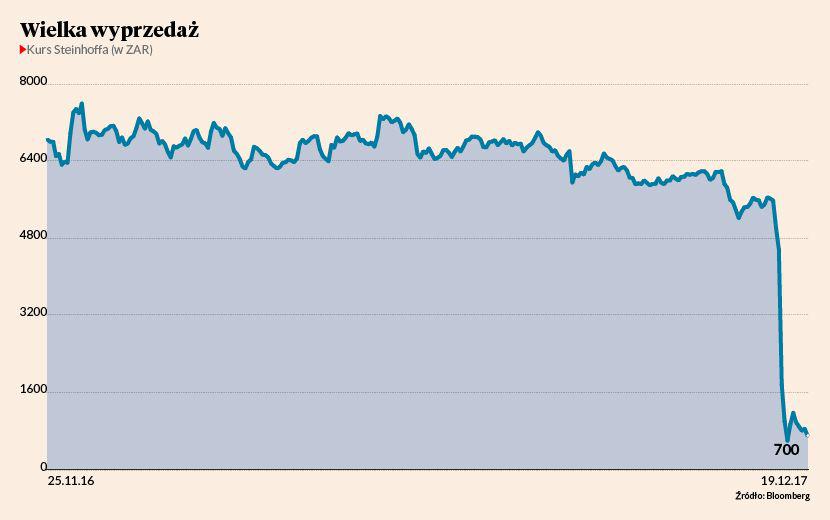 W ubiegłym tygodniu wyszło na jaw, że ubiegłoroczne dane finansowe miały niezbyt ścisły związek z rzeczywistością i muszą zostać zweryfikowane. Kurs akcji na giełdzie w Johannesburgu nurkuje — od początku grudnia kapitalizacja grupy zmniejszyła się o ponad 80 proc., do niespełna 40 mld ZAR (około 11 mld zł). We wtorek nowy zarząd Steinhoffa spotkał się z przedstawicielami kredytujących grupę banków, by rozpocząć negocjacje w sprawie restrukturyzacji finansowania i wizji przyszłości spółki.