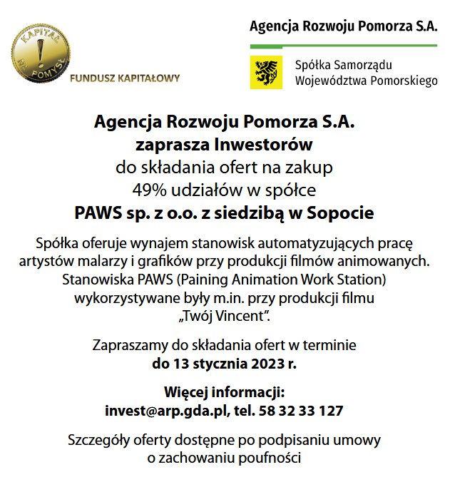 Agencja Rozwoju Pomorza S.A. zaprasza Inwestorów do składania ofert na zakup 49% udziałów w spółce PAWS sp. z o.o. z siedzibą w Sopocie Komunikat partneraopublikowano: 2022-12-22 12:42PosłuchajZostań subskrybentemi słuchaj tego oraz wielu innych artykułów w pb.pl