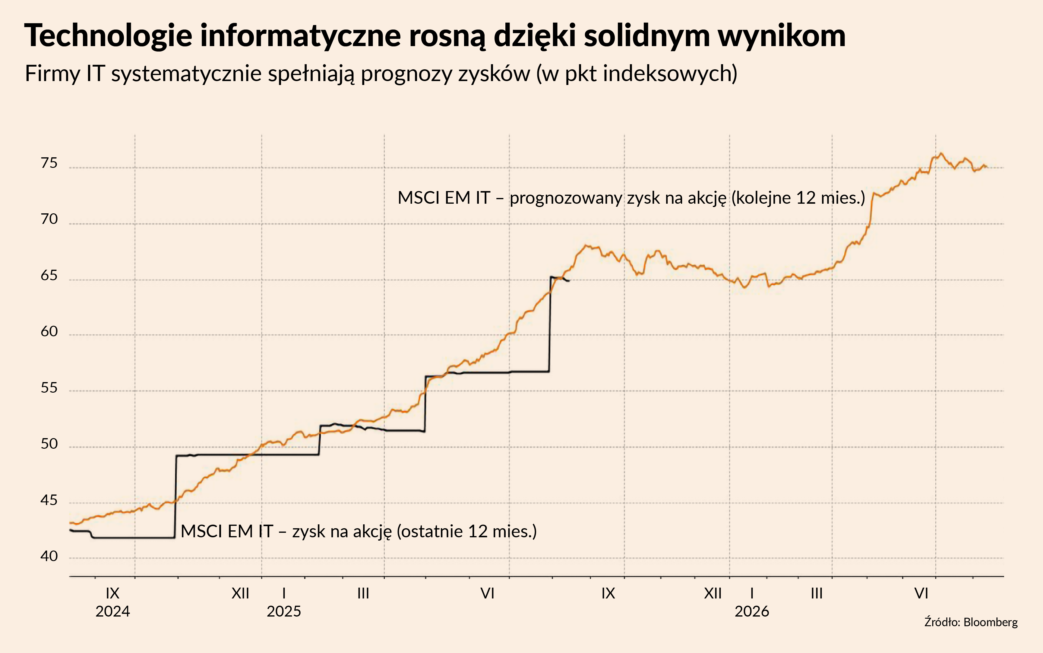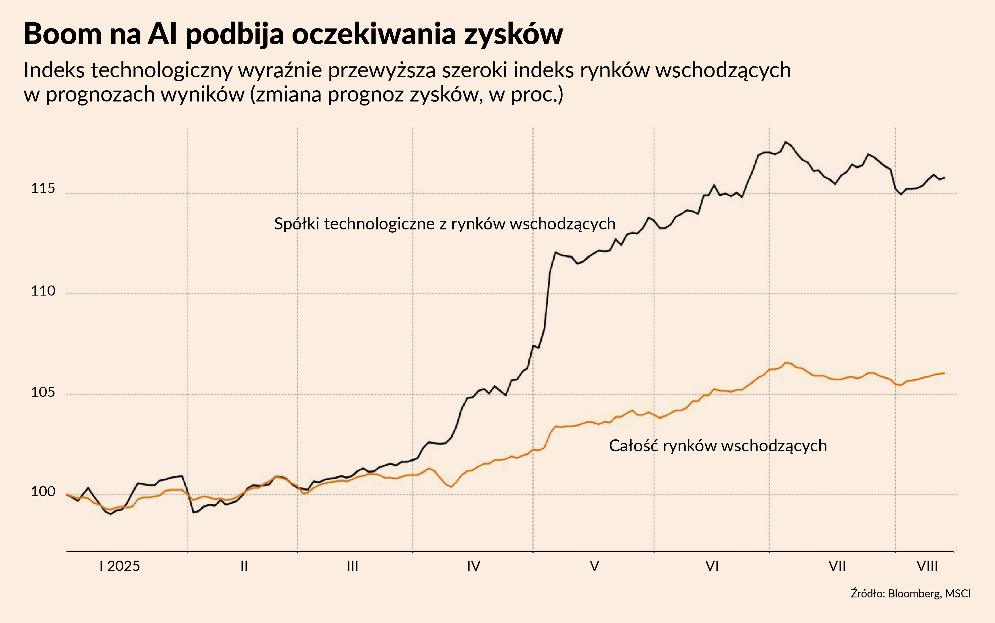 Dla rynków wschodzących to szansa na przełamanie negatywnego trendu – od 2022 r. wyniki firm były regularnie słabsze od prognoz analityków. Dopiero spółki technologiczne związane z AI zaczęły od końca ubiegłego roku systematycznie spełniać oczekiwania, co odbudowuje zaufanie inwestorów.