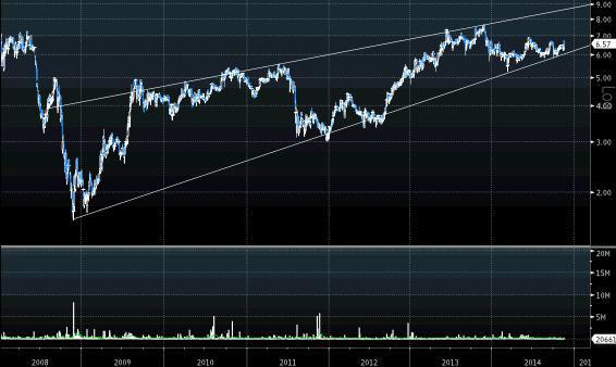 Odbicie kursu od wsparcia, leżącego obecnie na wysokości 6,05 zł, oznaczałoby rozpoczęcie przynajmniej kilkumiesięcznej fali zwyżek. Mogłyby one sięgnąć górnego ograniczenia klina, leżącego na wysokości 8,60 zł, pooznaczałoby 30-procentowy potencjał umocnienia. Dolne ograniczenie formacji powinno pozostać twardym dnem, a to oznacza, że ewentualna korekta nie powinna przekroczyć 8 proc.