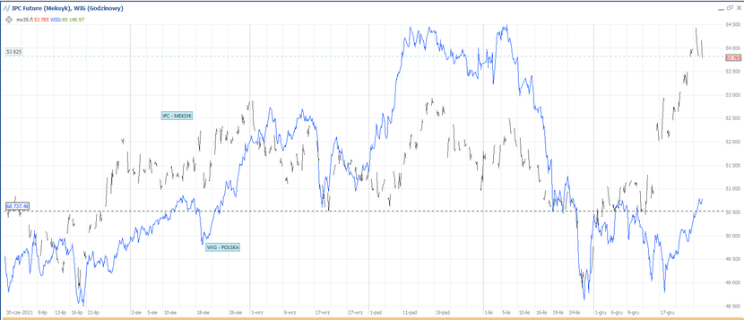 – Nawet pobieżna analiza wykresu godzinowego WIG (kolor niebieski) i meksykańskiego IPC (kolor czarny) wskazuje bardzo duże podobieństwo w zachowaniu obu indeksów. Te same są fale wzrostowe i spadkowe - może o nieco innym zasięgu, ale nie można oczekiwać, aby oba indeksu poruszały się identycznie - zauważa ekspert “PB”.