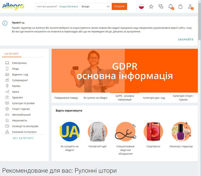 Oferta skierowana jest m.in. do rosnącej rzeszy uchodźców z Ukrainy oraz ukraińskojęzycznych klientów i ma pomów w korzystaniu z serwisu, zarządzania kontem i płatnościami. To kolejny przetłumaczony interfejs po tym jak w marcu Allegro uruchomiło swoją aplikację w języku angielskim.