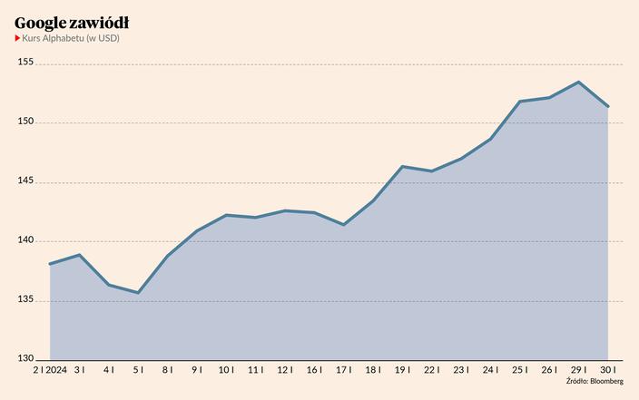 Przychody Alphabetu w ostatnim kwartale 2023 r. wyniosły 86,31 mld USD, a sprzedaż 72,3 mld USD. Obie wielkości były znacznie lepsze w ujęciu r/r i przebiły oczekiwania analityków, podobnie jak zysk na akcję, który uplasował się na poziomie 1,64 USD. Inwestorów to jednak nie zadowoliło, bo ich oczy przykuły kiepskie dane dla podstawowego biznesu spółki. Kurs w handlu posesyjnym zjechał o 6 proc.