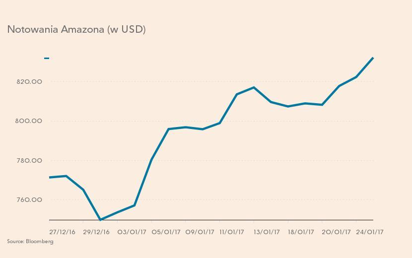Od początku roku kurs Amazona rośnie na amerykańskiej giełdzie. Inwestorzy płacili dziś za jedna akcję spółki ponad 820 USD.