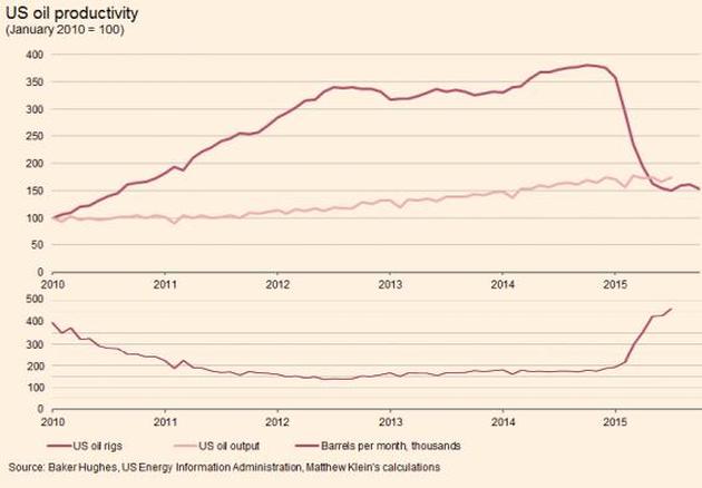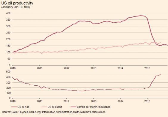 „Amerykańscy producenci ropy zdołali zrównoważyć wpływ spadku liczby odwiertów wzrostem efektywności” – zauważa Matthew Klein.