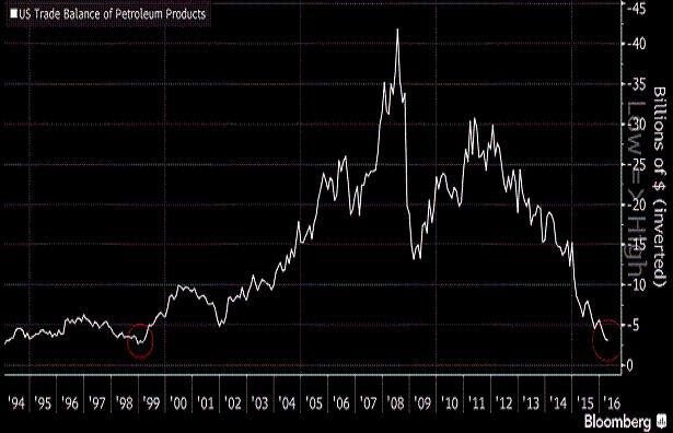 W kwietniu USA wyeksportowały produkty naftowe warte 7,2 mld USD, o 16 proc. mniej niż w tym samym miesiącu 2015 r., podczas gdy import towarów z tej kategorii spadł o 34 proc. do 10,3 mld USD, poinformował w ubiegłym tygodniu departament handlu. Tym samym ujemne saldo w handlu produktami naftowymi spadło najniżej od 1999 r., okresu kiedy – między innymi dzięki niskim cenom surowców energetycznych – gospodarka amerykańska przeżywała boom.