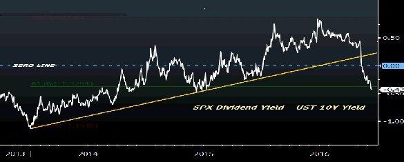 W tym tygodniu rentowność obligacji USA była o 43 punkty bazowe wyższa od stopy dywidendy spółek z głównego wskaźnika zza oceanu S&P500. To oznacza, że obligacje są najbardziej atrakcyjne na tle akcji od połowy 2015 r., a w ostatnich latach podobnych rozmiarów rozbieżność nigdy nie utrzymywała się dłużej niż 1-2 miesiące, zauważa Sejul Gokal, strateg Bloomberga.