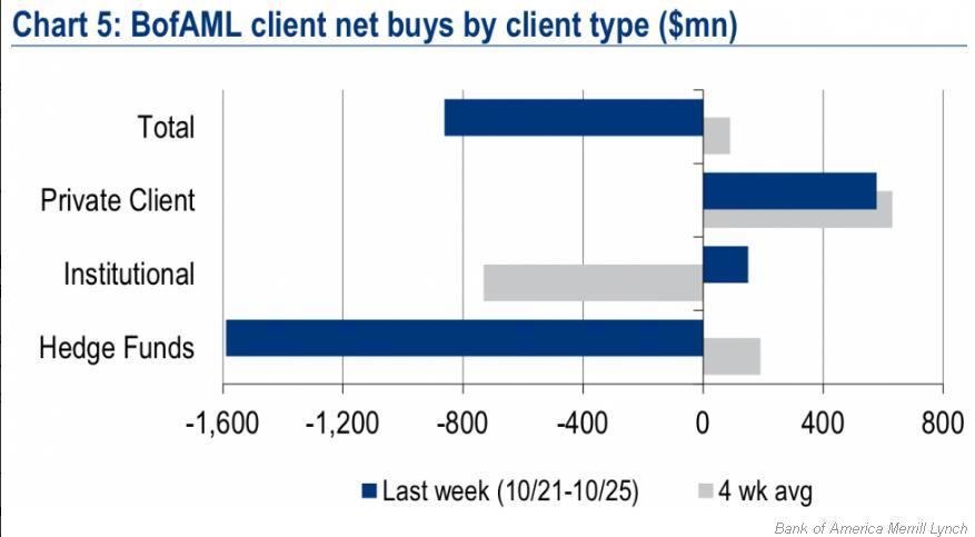 W ubiegłym tygodniu klienci banku sprzedali, po potrąceniu zakupów, akcje notowane na giełdzie nowojorskiej warte 963 mln USD, wynika z danych BofA Merrill Lynch, do których dotarł portal BusinessInsider.com. Klienci kwalifikowani przez instytucję jako fundusze hedingowe sprzedali najwięcej akcji od grudnia 2008 r., kiedy przypadło dno paniki rynkowej po upadku banku Lehman Brothers. Mimo to fundusze hedgingowe wciąż pozostają kupującymi netto w horyzoncie sięgającym do początku roku.