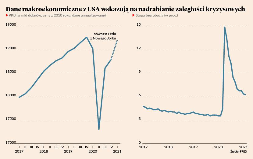 Tworzone przez regionalne banki centralne w USA tzw. nowcasty, czyli szacunki wzrostu PKB w bieżącym kwartale, pokazują, że pierwszy kwartał roku może być dobry dla gospodarki. Na przykład nowcast tworzony przez Fed z Nowego Jorku wskazuje na wzrost PKB o 2,1 proc. kwartał do kwartału, a nowcast Fed z Filadelfii - na wzrost o 2,4 proc. Jeżeli te prognozy się sprawdzą, poziom PKB w pierwszym kwartale będzie o 0,9 proc. wyższy rok do roku oraz zaledwie 0,4 proc. mniejszy od poziomu z ostatniego kwartału 2019 r., który można traktować jako punkt referencyjny dla zachowania gospodarki w trakcie epidemii.