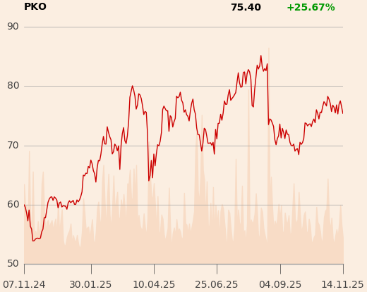 "Przy wskaźnikach C/WK 1,5x dla prognoz na 2026 i 1,4x na 2027 r. PKO BP notowane jest zgodnie ze średnimi mnożnikami polskich banków. Jednak naszym zdaniem PKO BP zasługuje na niewielką premię w stosunku do konkurentów, biorąc pod uwagę ponadprzeciętny zwrot na kapitale własnym (ROE) na poziomie 20 proc. oczekiwany w latach 2026 i 2027 oraz stopę dywidendy w wysokości 7–8 proc." - napisano w uzasadnieniu raportu z 7 listopada.