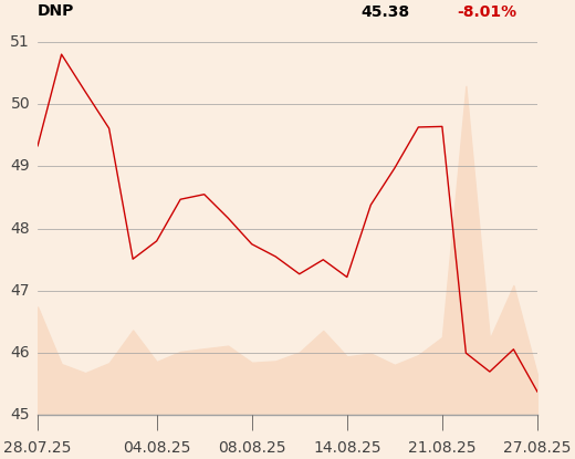 Na zamknięciu sesji we wtorek, 26 sierpnia, kurs wyniósł 46,06 zł po wzroście o 0,79 proc. Trzy poprzednie sesje zakończyły się spadkiem notowań w sumie o 8 proc., do czego walnie przyczyniło się opublikowanie przez spółkę niższych od oczekiwań analityków wyników za drugi kwartał. Spółka zamknęła go zyskiem netto w wysokości 397,5 mln zł, o 9 proc. niższym od konsensu prognoz analityków.