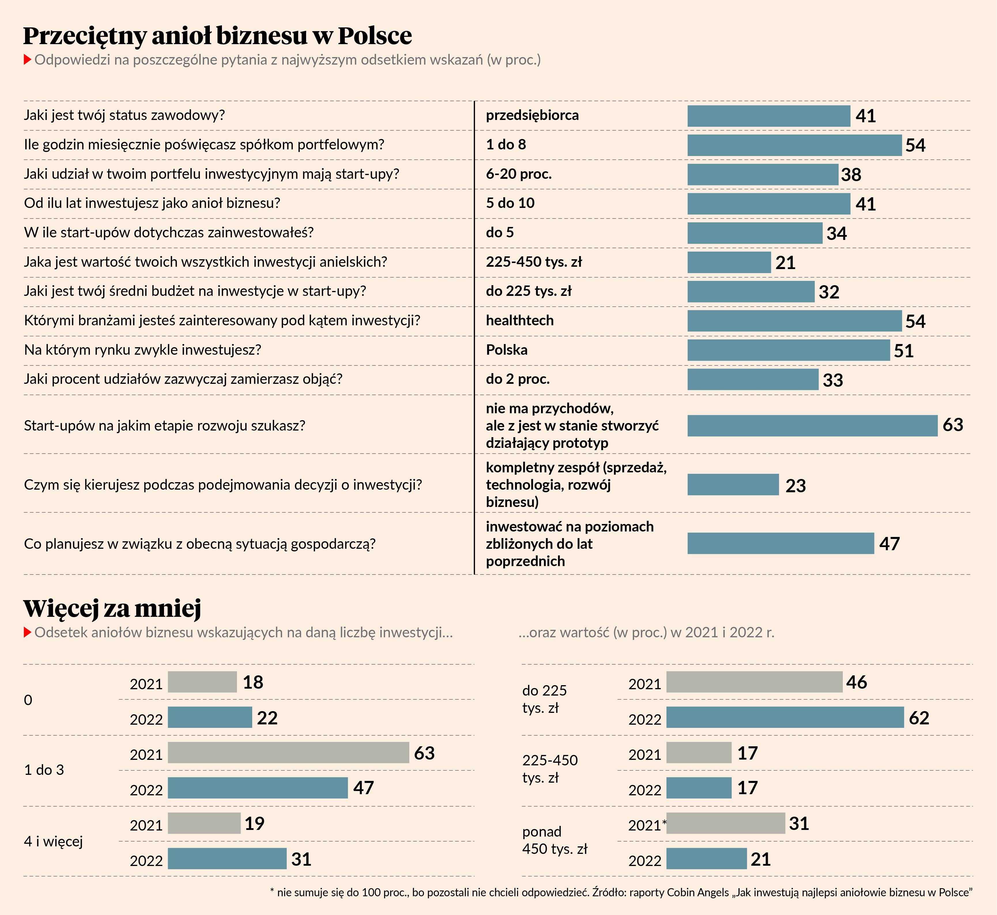 Z raportu Cobin Angels „Jak inwestują najlepsi aniołowie biznesu w Polsce” wynika, że odsetek osób, które nie zainwestowały w żaden start-up, wzrósł w 2022 r. z 18 do 22 proc. Nie był to też dobry moment na kończenie inwestycji — 67 proc. respondentów nie odnotowało żadnego tzw. exitu, a 24 proc. najwyżej dwa.