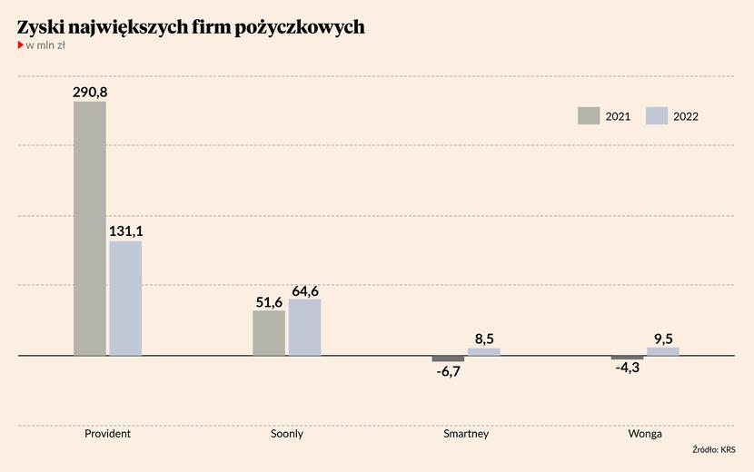 Bieżący rok będzie trudny dla branży i tak dobrych wyników jak w 2022 r. raczej nie można oczekiwać. Do KRS powoli spływają raporty finansowe firm pożyczkowych za ubiegły rok. Z dostępnych danych wynika, że lider rynku - Provident - zarobił 131 mln zł, czyli sporo mniej niż w 2021 r., kiedy zysk wyniósł 290 mln zł. Wtedy jednak wynik w sporej części został podpompowany przez rozliczenia podatkowe. Na koniec 2022 r. suma bilansowa Providenta wyniosła 1,9 mld zł (2 mld zł rok wcześniej) i była dwa razy wyższa od bilansu Smartney’a, gracza numer dwa na rynku pod względem wielkości biznesu, który przez ostatnie lata rósł jak na drożdżach. Francuski pożyczkodawca po raz pierwszy odnotował zysk 8,5 mln zł.