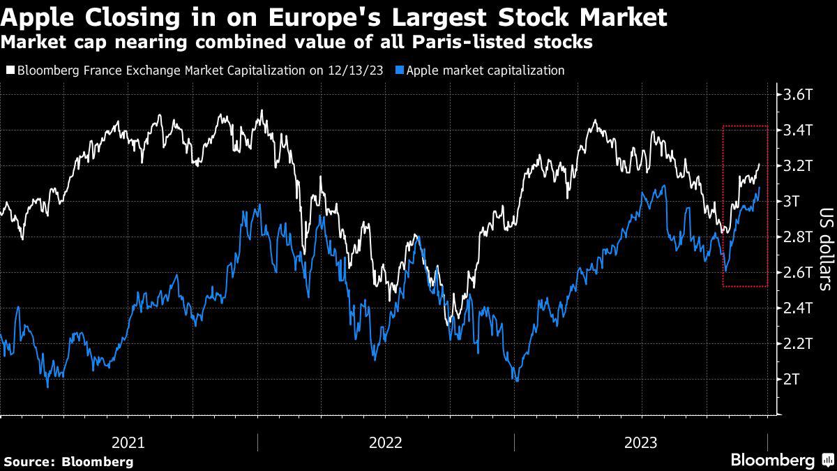 W tym momencie Apple jest mniejsze od zaledwie sześciu największych giełd na świecie. Tymczasem parkiet w Paryżu osiągnął w tym tygodniu rekordowy poziom.