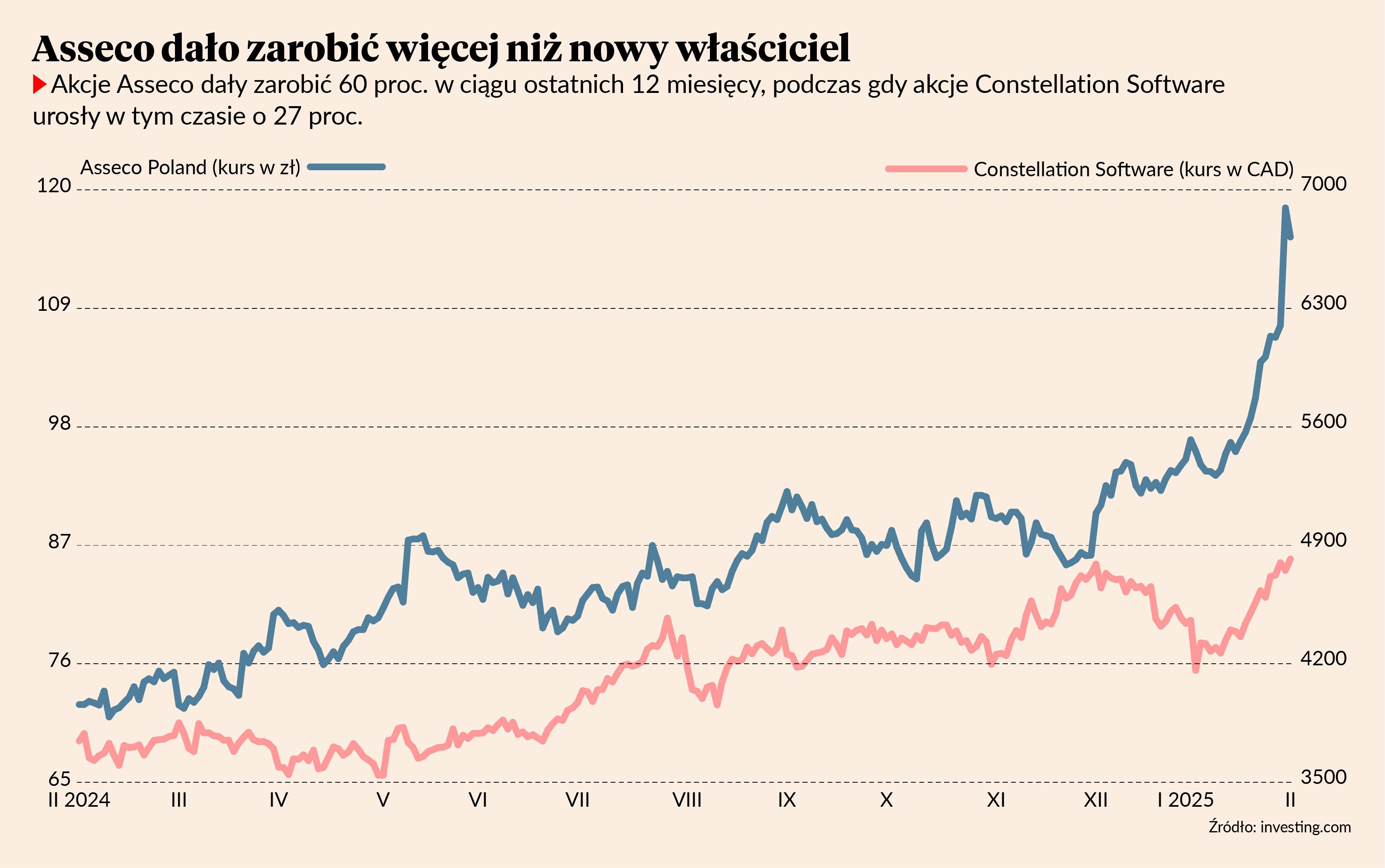 - Podmiot, który pośrednio zainwestował w Asseco, czyli Constellation Software, należy w ostatnich latach do najlepiej zachowujących się spółek z Ameryki Północnej i posiada wiele firm IT w swoim portfolio, w tym notowane na GPW Sygnity – mówi Adrian Kowollik, analityk East Value Research.