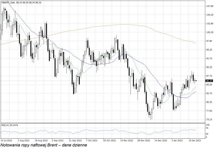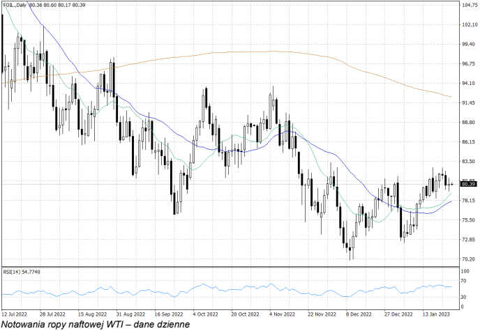 Wczorajsze dane dotyczące zapasów paliw w Stanach Zjednoczonych okazały się neutralne. Departament Energii podał, że w poprzednim tygodniu zapasy ropy naftowej wzrosły nieznacznie, o 533 tys. baryłek (podczas gdy oczekiwano zwyżki o 1,6 mln baryłek, a Amerykański Instytut Paliw oszacował wzrost o ponad 3 mln baryłek). Wzrost ten oznacza jednak, że zapasy ropy naftowej w USA dotarły do najwyższych poziomów od czerwca 2021 roku. Zwyżkowały także zapasy benzyny, co sugeruje, że póki co popyt na ropę naftową w USA pozostaje przytłumiony.