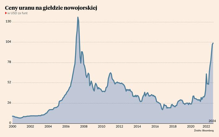Jeszcze wiosną 2023 r. uran kosztował niespełna 50 USD/lb i nie budził większych emocji wśród inwestorów. Ale już we wrześniu jego cena przekroczyła 70 USD/lb, a w styczniu po raz pierwszy od wielu lat przełamała barierę 100 USD. Obecne notowania są najwyższe od lat 2006-07, gdy na uranowych kontraktach urósł całkiem pokaźny balon spekulacyjny.
