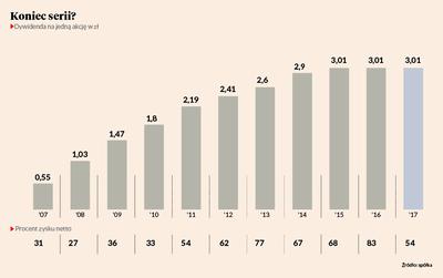 Nieco bardziej pesymistycznie nastawiony jest Paweł Szpigiel. Oczekuje on spadku wypłacanej dywidendy z obecnych 3,01 zł na jedną akcję do 2 zł, ale dopiero od 2019 r. Analityk uważa, że utrzymanie obecnego poziomu w dłuższym terminie wiązałoby się z silnym wzrostem zadłużenia do poziomu nawet dwukrotności rocznej EBITDA w 2021 r.