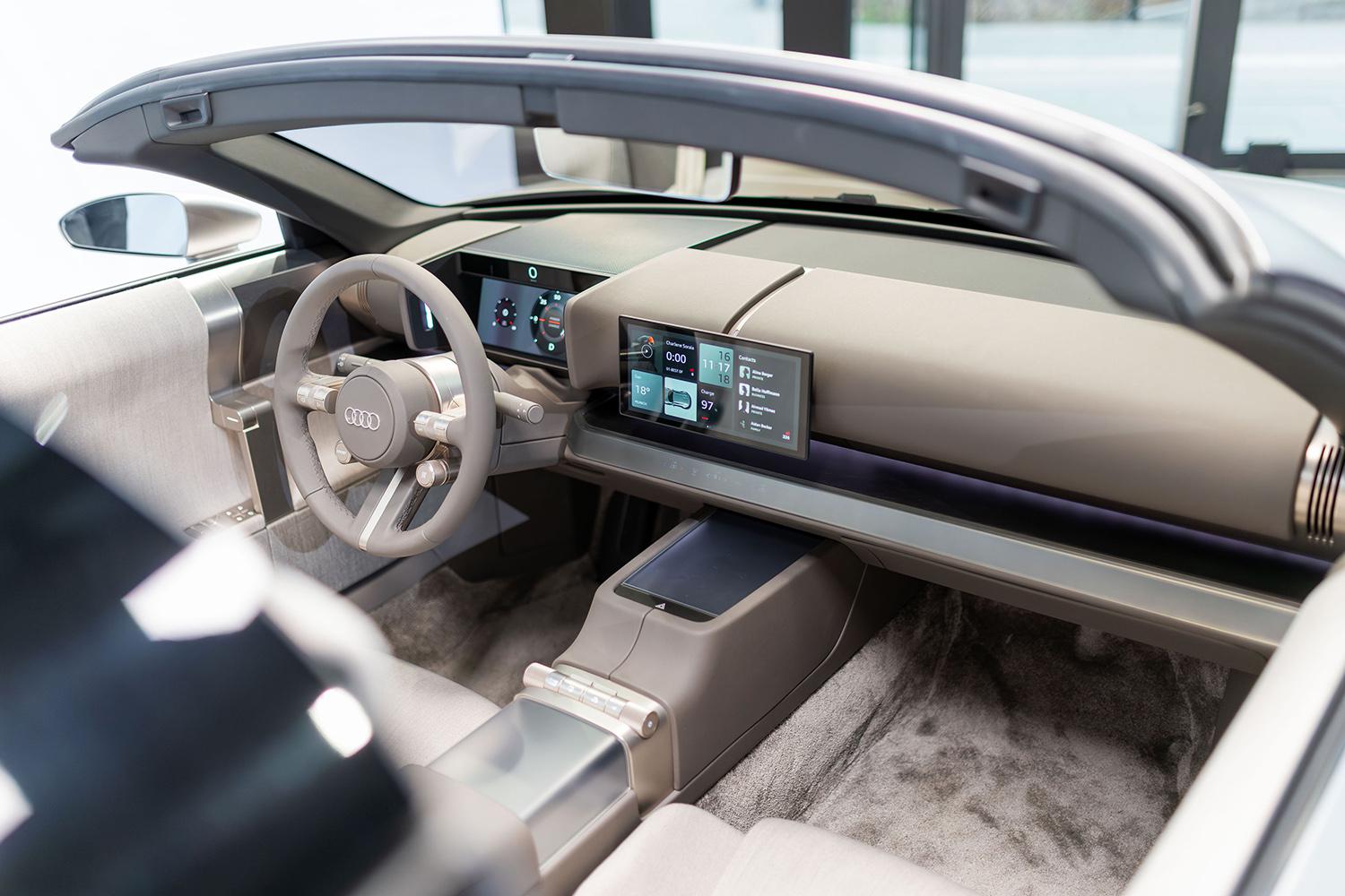Samochód ma centralnie umieszczony akumulator, elektrycznie składany dach z dwóch segmentów, monolityczną sylwetkę i kabinę przesuniętą do tyłu, mocno osadzoną na nadwoziu. Wymiary – 4520 mm długości, 1970 mm szerokości i 1285 mm wysokości – tworzą proporcje, które działają harmonijnie i spokojnie. Wnętrze z jednym 10,4-calowym wyświetlaczem! To wyraźny sygnał, że Audi nie chce wygrywać wyścigu na największy ekran. Chce wygrać wyścig o komfort poznawczy kierowcy. Napęd elektryczny. Wejdzie do produkcji?