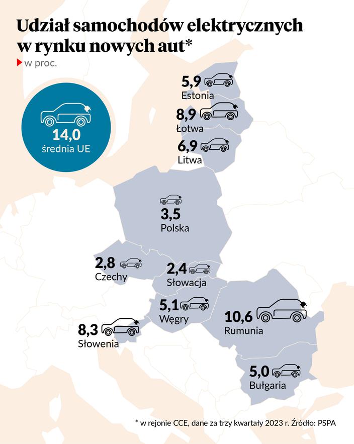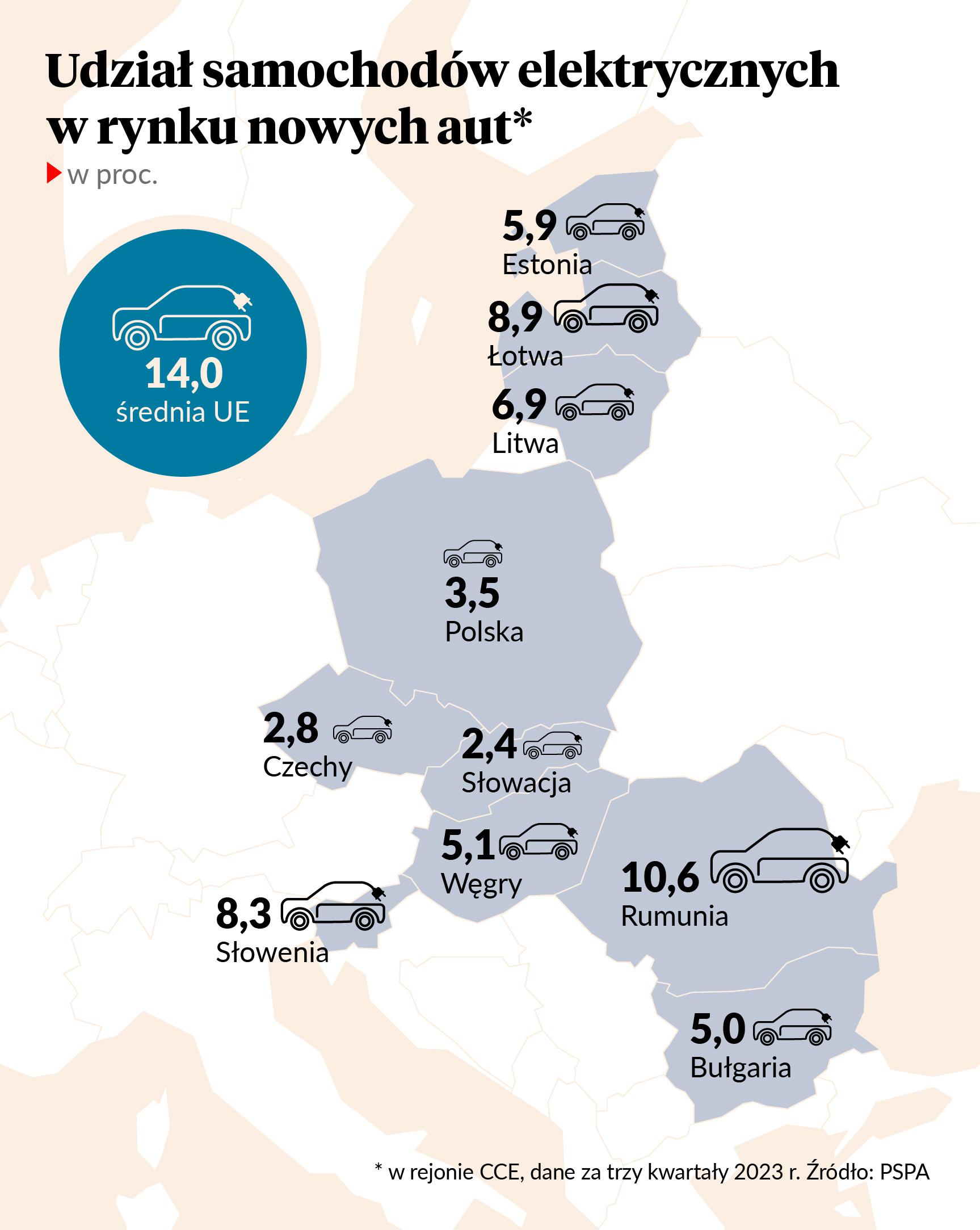 W Polsce natomiast jest lepiej i gorzej jednocześnie. Pod względem dynamiki wzrostu zainteresowania autami elektrycznymi znacznie wyprzedzamy średnią unijną. W 2023 r. zostało zarejestrowanych prawie 21 tys. nowych samochodów czysto elektrycznych, o 164 proc. więcej niż rok wcześniej. Dynamiczny przyrost liczby elektryków nie zmienia faktu, że udział tych aut w sprzedaży nie przekracza 4 proc. To nie tylko znacznie mniej niż na rynkach zachodnich, ale również jeden z najgorszych wyników w regionie CEE.