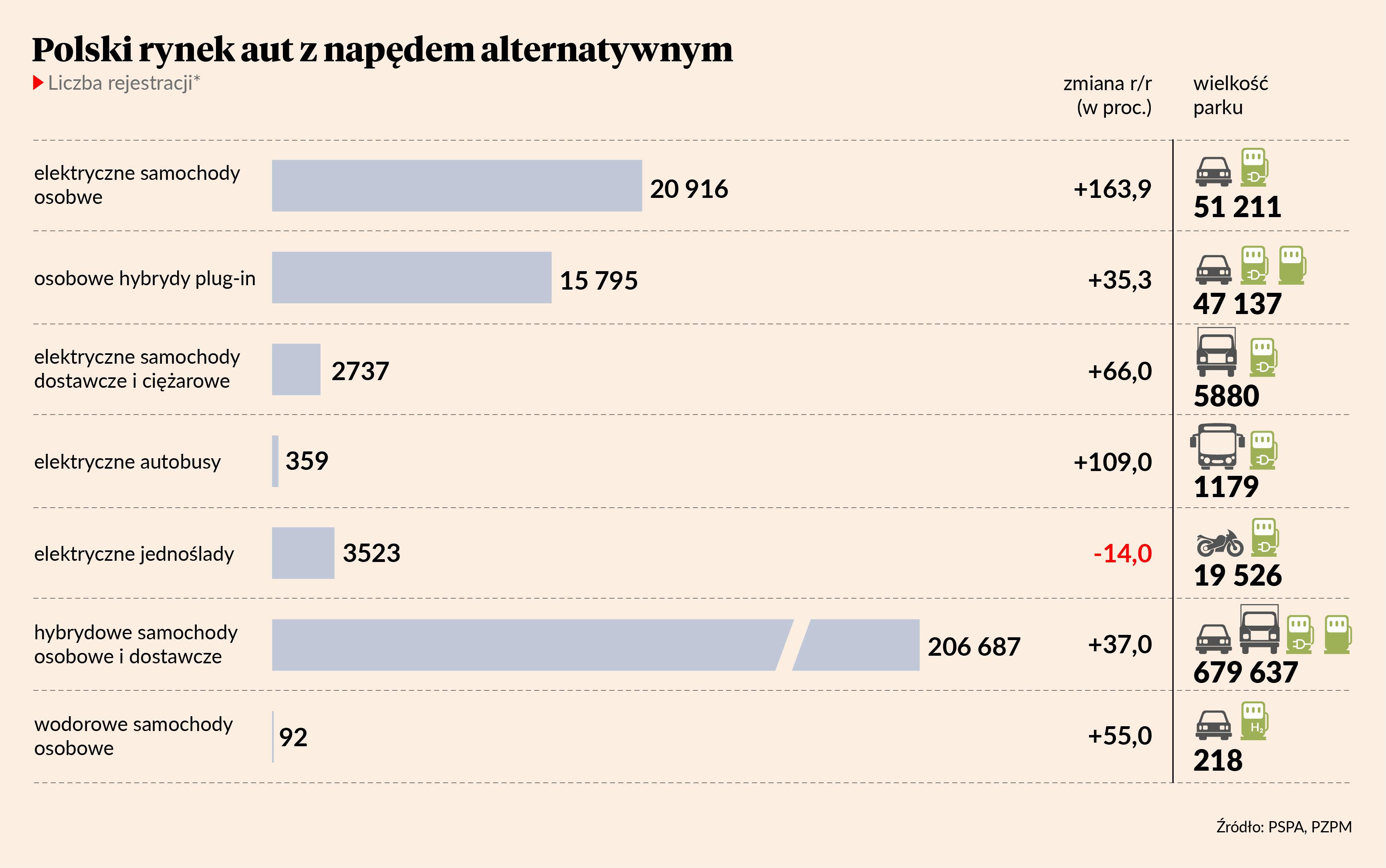 W Polsce jest inaczej — w 2023 r. przybyło blisko 15,8 tys. aut z tym napędem (+35,3 proc. r/r) i należy do nich niewiele ponad 3,3 proc. rynku.