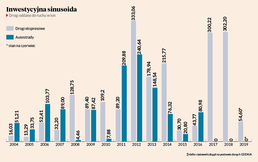 W 2017 i 2018 r. oddawano po około 300 km dróg ekspresowych rocznie. Ostatnio tak dużo udało się uruchomić w 2012 r. W sumie w tej perspektywie GDDKiA zamierza zbudować 2,5 tys. km ekspresówek, 445 km obwodnic i „tylko” 253 km autostrad, podczas gdy w poprzedniej perspektywie powstało ponad 880 km tras tej kategorii. W ostatnich latach dyrekcja nie oddała do użytku ani kilometra autostrady, ponieważ w zaktualizowanym dwa lata temu programie inwestycyjnym przesunęła termin realizacji wielu projektów z 2018 na 2019 r. Chodzi m.in. o inwestycje realizowane na autostradzie A1 od Pyrzowic do Częstochowy. Pierwotnie miały być wykonane w ubiegłym roku, ale termin okazał się nierealny. Na przełomie lipca i sierpnia GDDKiA odda do ruchu 30 km tej trasy.