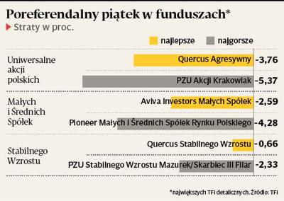 Quercus nie ma typowego funduszu małych i średnich spółek. Paradoksalnie jednak to indeks mWIG40 został przeceniony najbardziej. W jeden dzień stracił 4,92 proc. sWIG80 stracił natomiast najmniej z głównych indeksów — tylko 3,22 proc. Z tego też powodu analiza funduszy małych i średnich spółek jest trudniejsza niż ogólnoakcyjnych. Jednak również w grupie funduszy małych i średnich spółek najlepiej poradziły sobie produkty Avivy i NN. Błysnął szczególnie fundusz Aviva Investors Małych Spółek. W piątek stracił 2,59 proc.