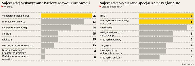 Według badania przeprowadzonego przez Deloitte największą barierą w rozwoju innowacyjności jest niedostateczna współpraca sektorów nauki z biznesem — wskazało na nią 75 proc. badanych. Druga częsta przeszkoda to brak regionalnych liderów innowacji (63 proc.). Respondenci z regionów wskazują też na przeszkody związane z finansowaniem, a więc m.in. niewystarczające nakłady przedsiębiorstw na B+R, silne uzależnienie od zewnętrznych źródeł finansowania (np. z UE) oraz brak finansowania dla przedsięwzięć wysokiego ryzyka. Regiony mają jeszcze mnóstwo do zrobienia, jeśli chodzi o systemy wspierania innowacji, jednak są już pierwsze przykłady dobrych praktyk. I tak Pomorze stworzyło wieloletni program wspierania trzech rodzajów klastrów — kluczowych, subregionalnych i sieci technologicznych.