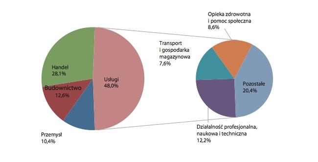 Polskie małe i średnie przedsiębiorstwa częściej prowadzą działalność usługową (48,0 proc.) i handlową (28,1 proc.) niż budowlaną (12,6 proc.) czy przemysłową (10,4 proc.). Struktura branżowa MSP jest nieco inna niż w UE. Widoczna w polskich firmach jest przewaga na rzecz handlu, w porównaniu do średniej w Unii, gdzie jest znacznie więcej firm usługowych. Również w budownictwie i przemyśle MSP jest silniej reprezentowane w Polsce niż w Unii. Jednak liczba małych firm usługowych w Polsce rośnie, co również zbliża strukturę polskiego sektora MSP do unijnego.